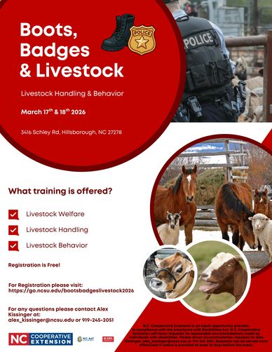 The Extension offices of Orange, Person, Chatham, and Caswell invite you to join us for our upcoming Boots, Badges & Livestock program. This specialized training is designed specifically for Animal Control, Law Enforcement, and First Responders across Caswell, Chatham, Orange, Person, Granville & surrounding counties.